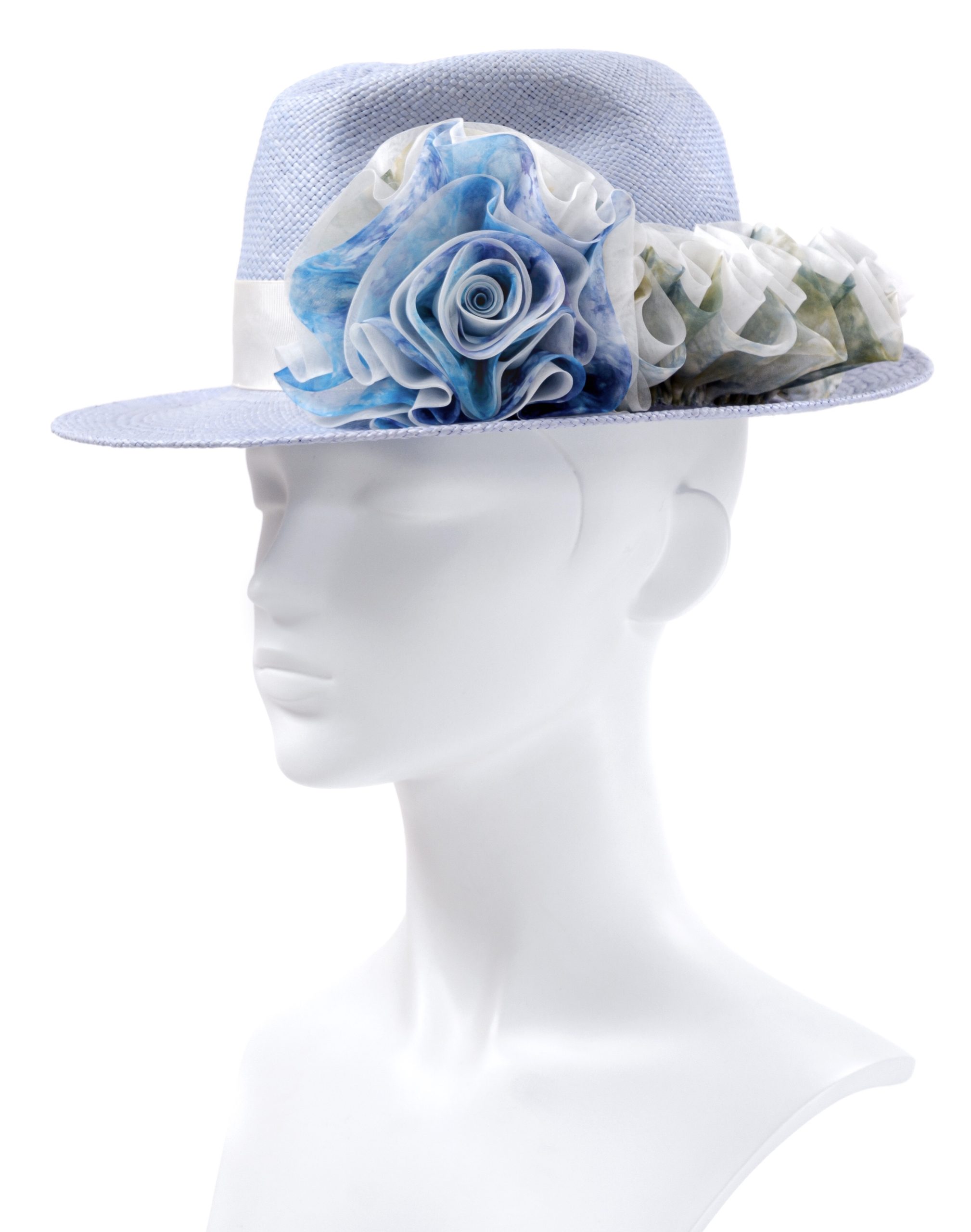 Pastel Blue Panama Fedora with Ice Dyed Rose and Ruffled Stem Detail