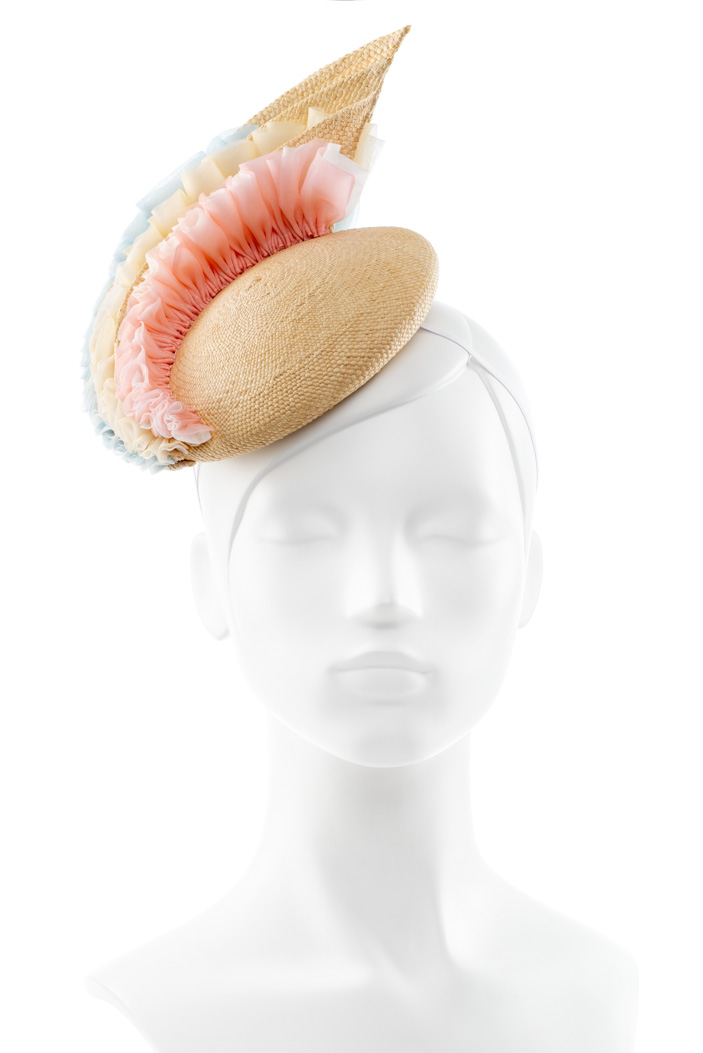 Natural Panama straw button base and wing detail with silk organza ruffles.